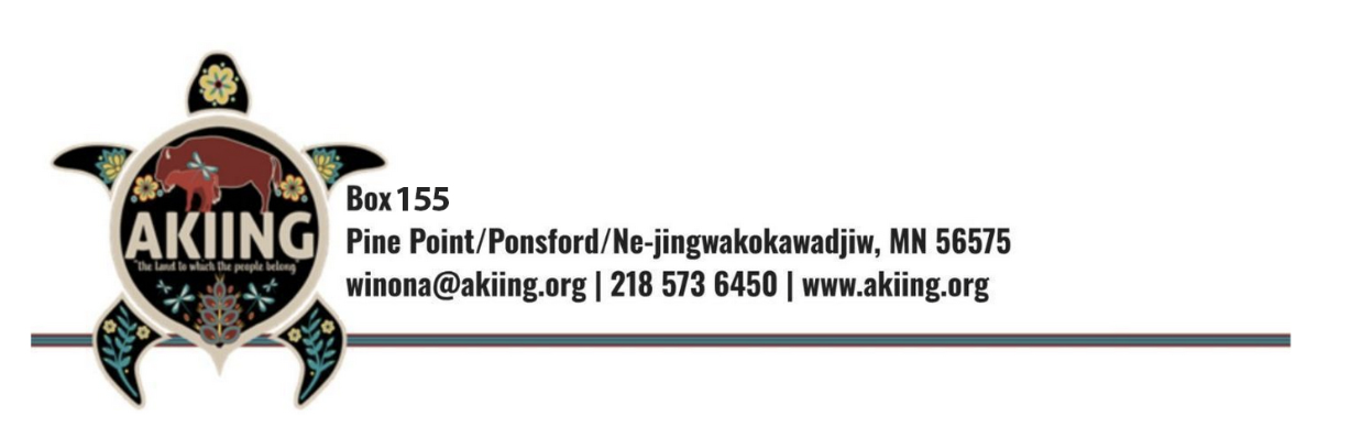 If you’d like to mail a check for your donation & to receive your wild rice, include your name, address where your wild rice should be mailed, plus a phone number. Mail your request to: Akiing, PO Box 155, Ponsford, MN 56575 You may also visit https://www.akiing.org/donate to make your donation there.